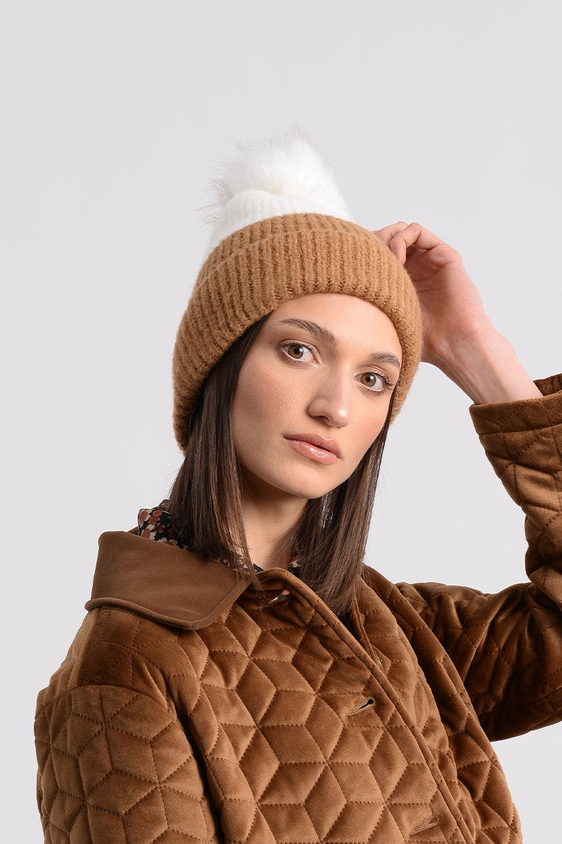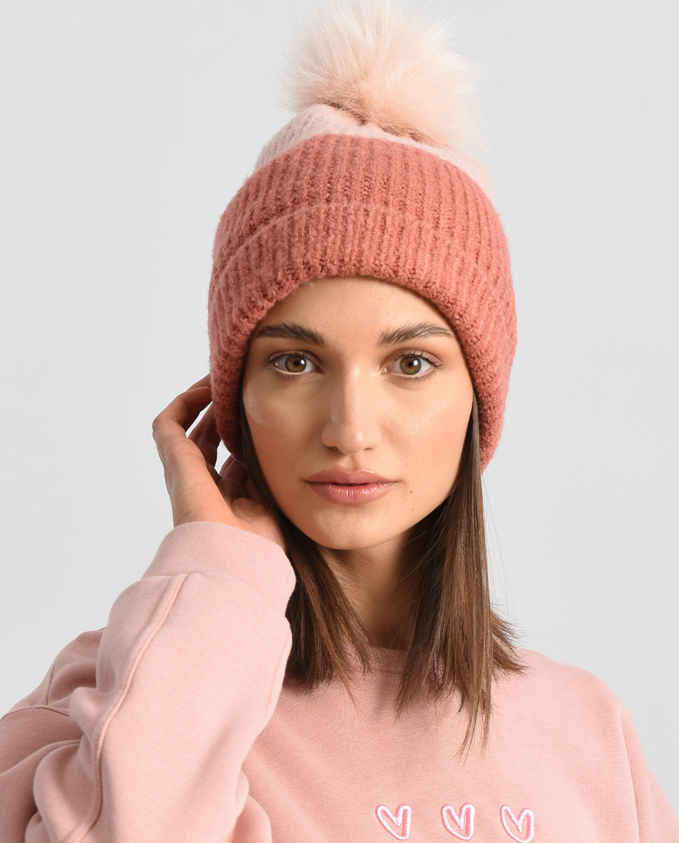 A super warm faux fur lining with a ribbed texture in a two beautiful shades with a faux fur pom on top.