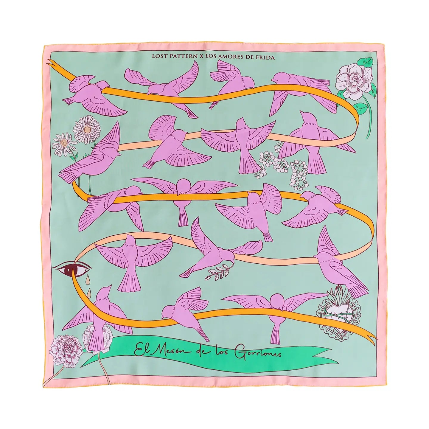 This stunning scarf is the result of a collaboration between LOST PATTERN and the Frida Kahlo family, and is a tribute to Frida Kahlo's legacy. The design was inspired by the kitchen mural in her family home that featured beautifully painted sparrows and the phrase "El Mesón de los Gorriones".In Mexican Spanish, "gorriones" means sparrows and "gorrones" means guests - a fun word game Frida played here. This emphasizes the warm and inviting nature of Frida's home, where she and her sister Cristina would often give away food to underprivileged women in their neighborhood.